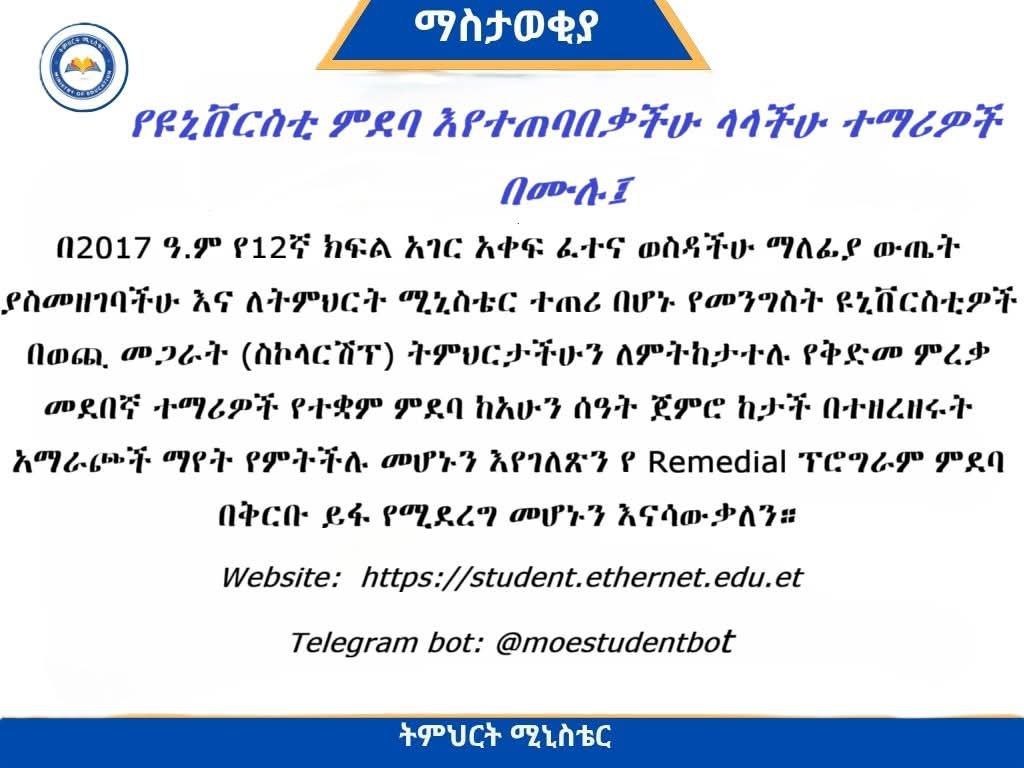 የRemedial ፕሮግራም ምደባ በቅርቡ ይፋ እንደሚደረግ ትምህርት ሚኒስቴር አሳውቋል።